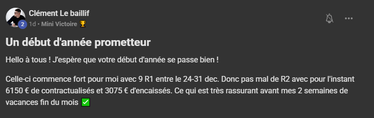 "9 R1 entre le 24-31 décembre 2025, 6 150 € contractualisé et 3075 € d'encaissés."